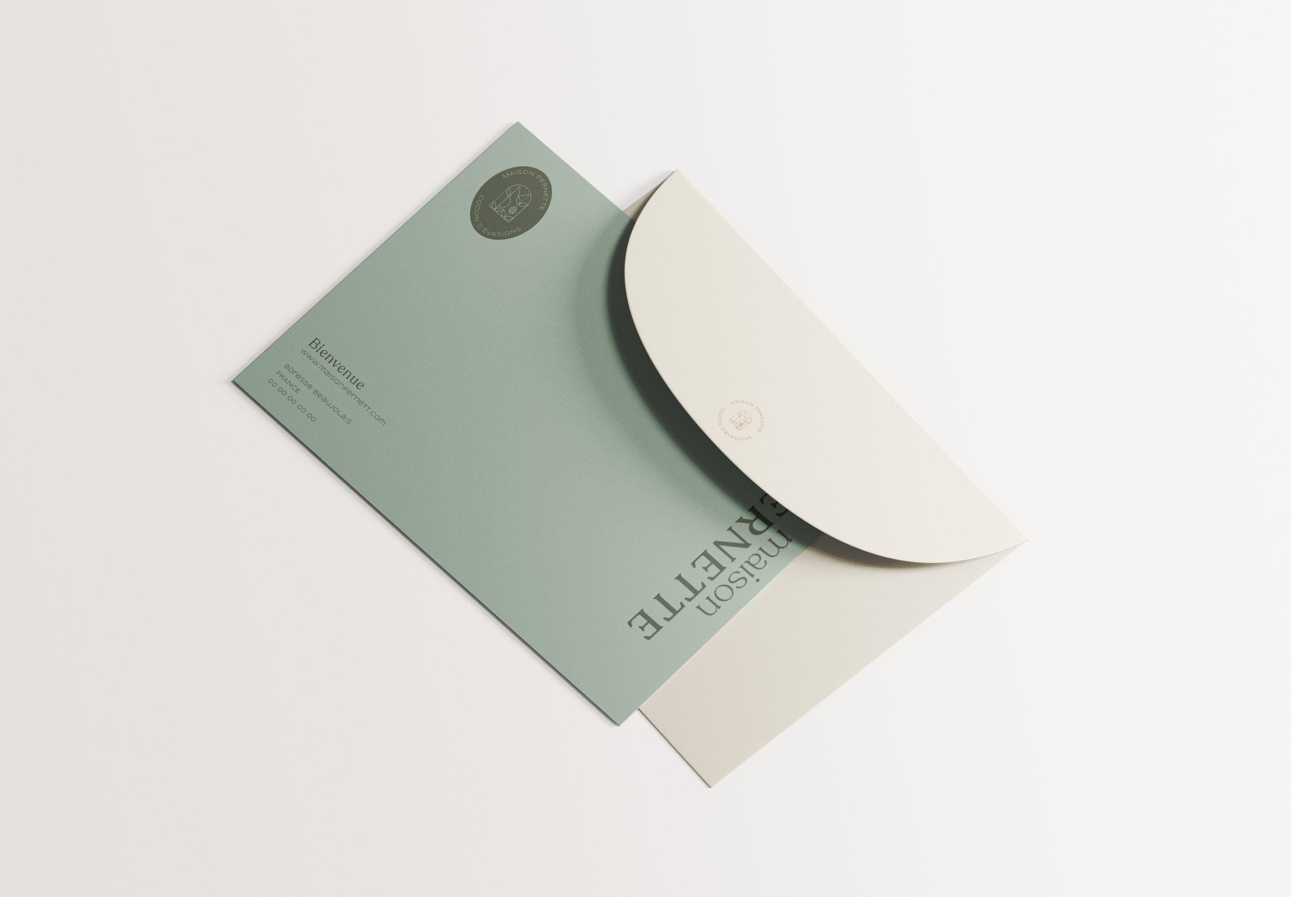 Le logotype a été conçu comme une forme protectrice évoquant un cocon. À l’intérieur se dévoilent subtilement les initiales M et P, dissimulées dans un jeu de feuillages délicats, accompagnées d’une coccinelle. L’ensemble crée un symbole à la fois poétique et ancré dans la nature environnante.